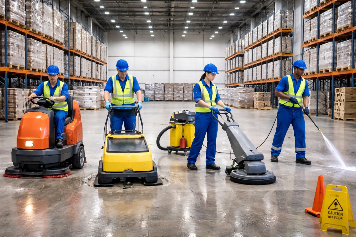 Heavy-duty cleaning solutions for warehouses, factories, and industrial environments.